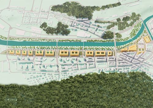 Urbanistická soutěžNavržená bloková struktura dostavby městského jádra vytváří výjimečně velkorysý longitudinální prostor nábřeží promenády cca 1,2 km dlouhé městské třídy rytmizované veřejnými prostranstvími umožňujícími průchod urbární strukturou až k zeleni náplavky Ohře. Významná jsou dvě mostní spojení, nové pěší lávky z Pravobřežní komunikace přes Ohři na její levý břeh (rozšíření Chebského mostu, tři nové pěší lávky a nový Charkovský most), které na pravém břehu vychází z nově komponovaných veřejných prostranství (náměstí, třídy, ulice). Základní premisou dostavby centrální části města je umístění IDT v přesunuté poloze na Náměstí u Tržnice, jeho pěší napojení k žel. Zastávce Dolní nádraží a spojení centra města s prostorem náplavky Ohře. Významné veřejné prostranství zároveň tvoří Náměstí republiky jako nové předpolí rozšířeného Chebského mostu.